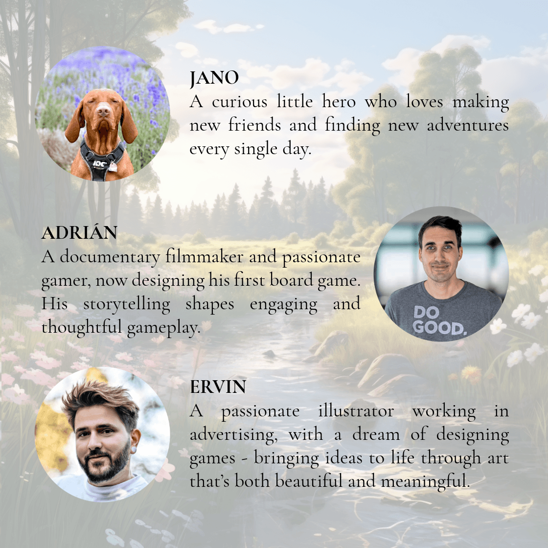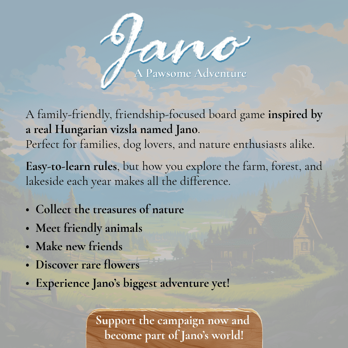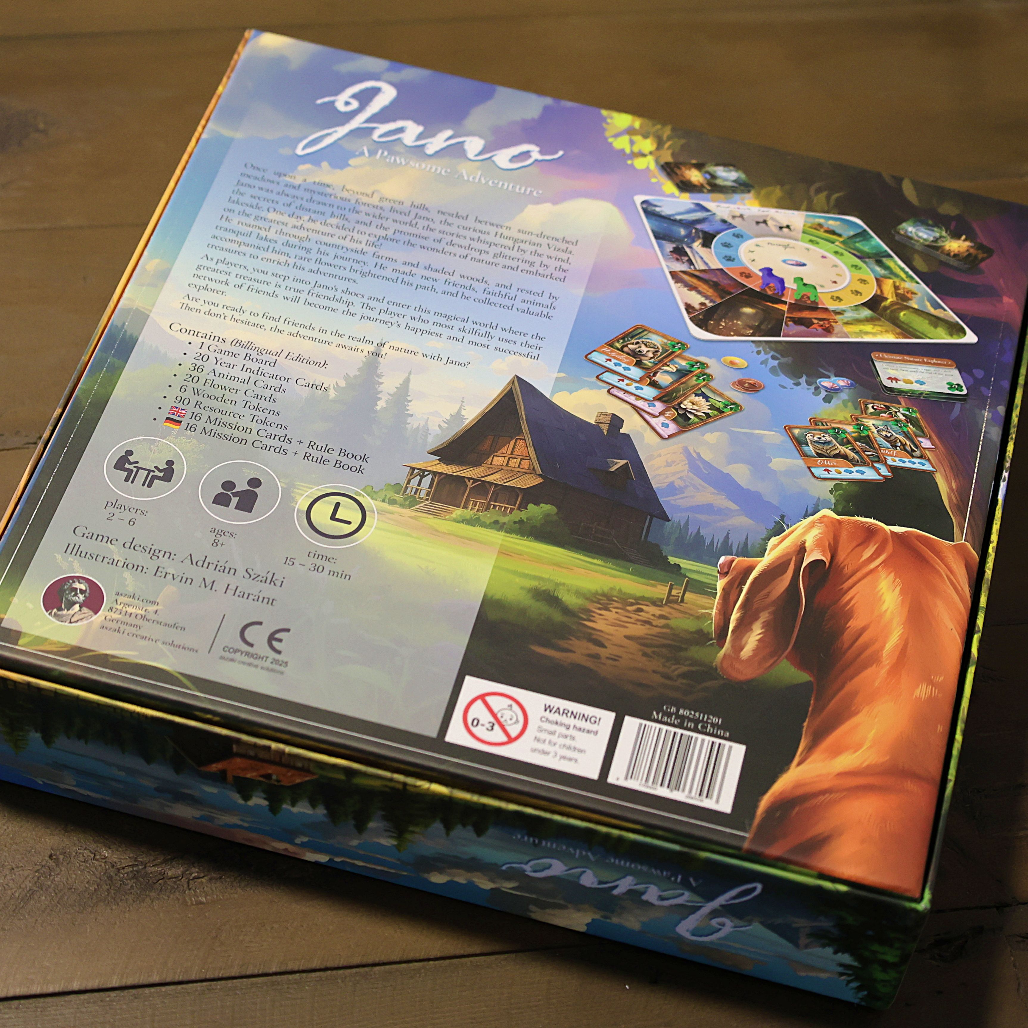 Jano ist ein herzerwärmendes, naturverbundenes Brettspiel, in dem die Spieler einen neugierigen ungarischen Vizsla auf eine bezaubernde Reise über Höfe, durch Wälder und entlang idyllischer Seen begleiten. Indem die Spieler Ressourcen sammeln, Freundschaften mit Tieren schließen, Blumen pflücken und geheime Aufgaben erfüllen, sammeln sie Siegpunkte und gestalten ihr ganz persönliches Abenteuer. Wer Natur und Freundschaft am einfühlsamsten lebt, wird am Ende zum glücklichsten Entdecker der Runde.