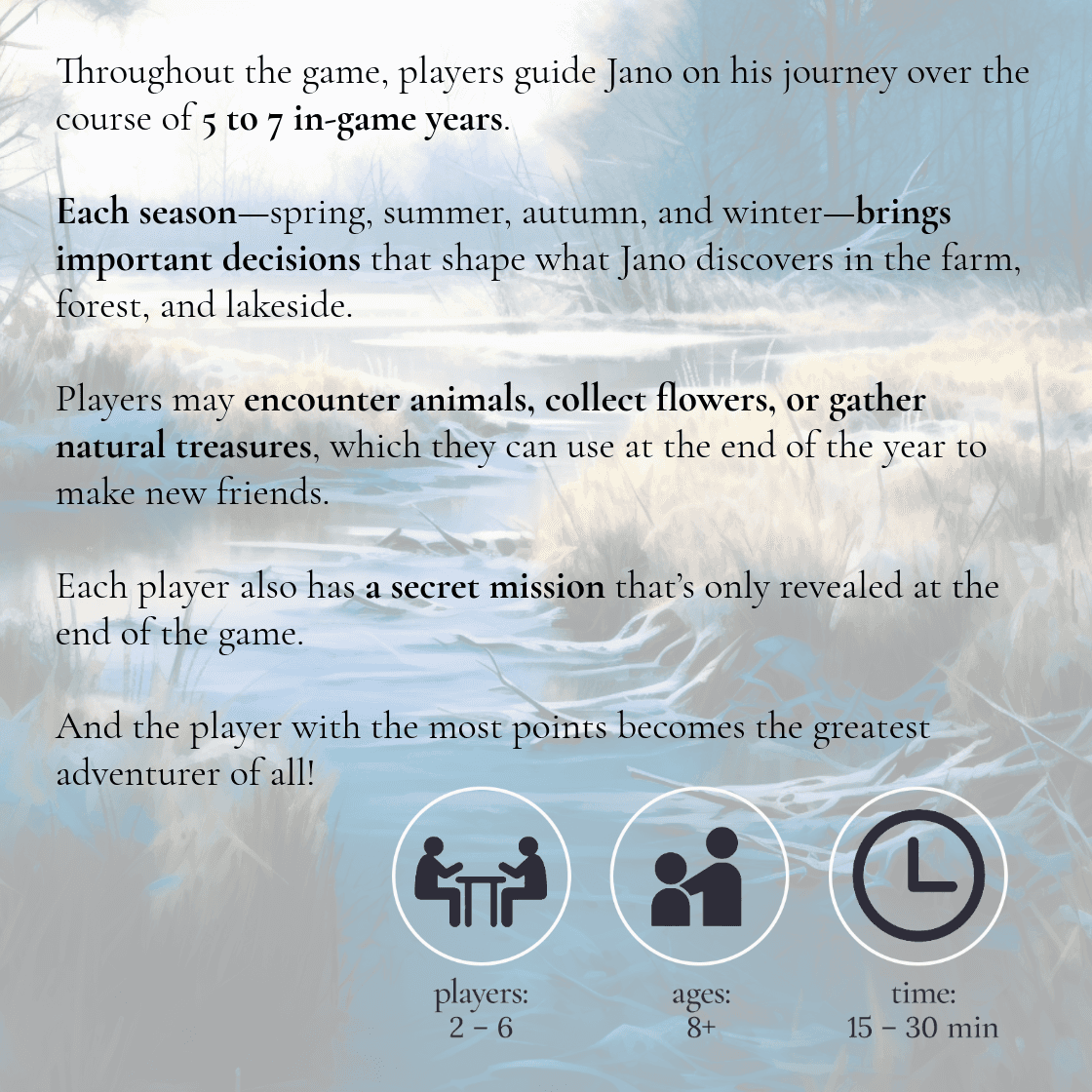 Im Spiel schlüpfen die Spieler in die Rolle von Jano, dem Hund. Je nach Spielerzahl dauert das Abenteuer zwischen fünf und sieben Spieljahren. In jedem Jahr - und in jeder Jahreszeit (Frühling, Sommer, Herbst und Winter) - entscheiden die Spieler, ob sie den Bauernhof, den Wald oder das Seeufer besuchen. Diese Entscheidungen sind wichtig, denn jedes Jahr bietet andere Naturschätze wie Eier, Pilze oder Muscheln sowie Gelegenheiten, Blumen zu sammeln oder Tieren zu begegnen.